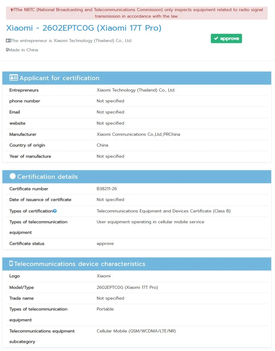 In related developments, the Xiaomi 17T Pro has received certification from Thailand’s NBTC authority, suggesting that the device is progressing steadily toward an official launch. The listing confirms the model number but does not disclose detailed specifications.